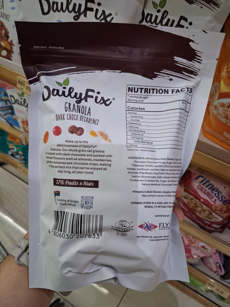 DailyFix Dark Choco₱224.10350g₱0.6450g3.0g0.094g17% Fruit/Nuts + Choco drops