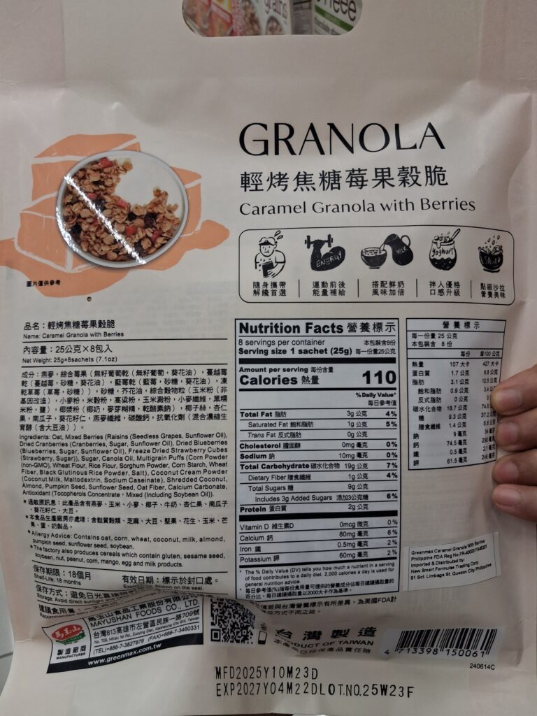 Greenmax Caramel₱240.00200g₱1.2025g1.0g0.033gOats, Mixed Berries, Coconut