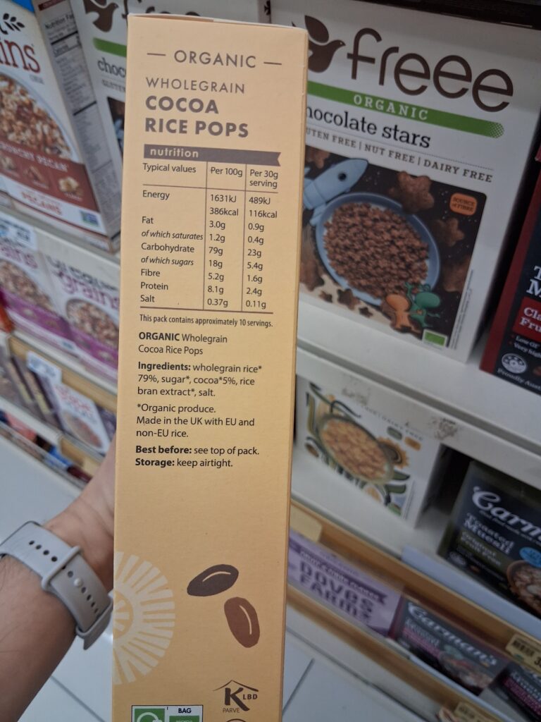 Doves Farm Cocoa Pops₱339.00300g₱1.1330g1.6g0.047g79% Wholegrain Rice, 5% Cocoa
