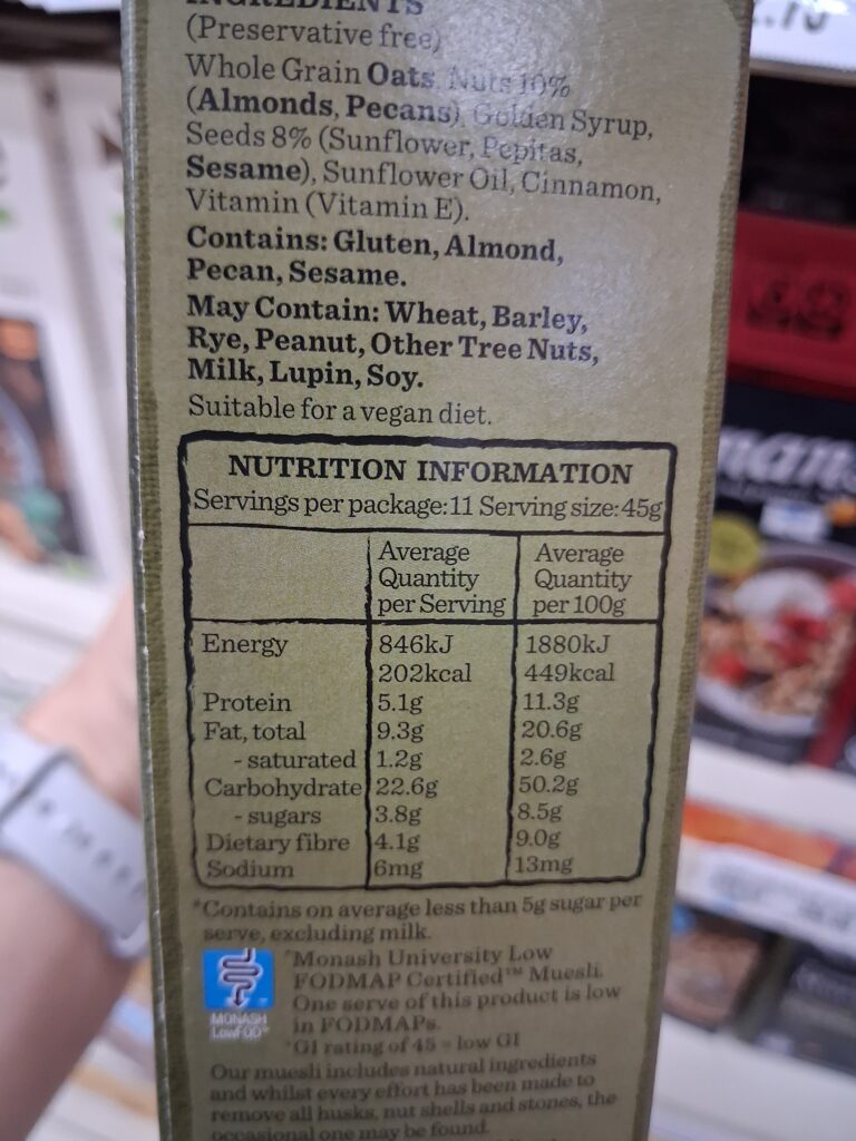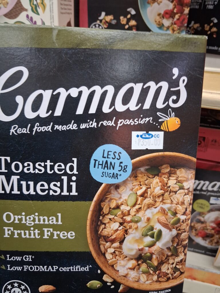 Carman’s Original (Fruit Free)₱350.00500g₱0.7045g4.1g0.130gOats, 10% Nuts (Almonds, Pecans), 8% Seeds